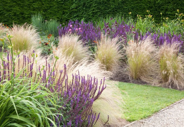 - для ландшафтного дизайна в деревенском стиле незаменимы сорта шалфея дубравного в сочетании со злаковыми и травами.
